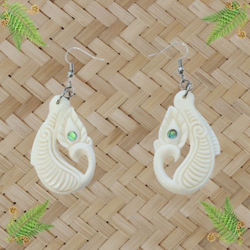 Bone Manaia with Paua Earrings. The Manaia is an ancient mythical being with a birds head and a human form. It is said to be the messenger between ...