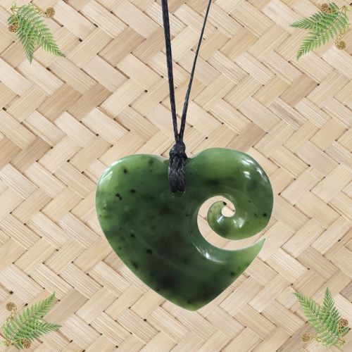 NZ Greenstone Heart with Korus Pendant. The stone is a Tangiwai Mix. Carved locally by Carol Forbes. Size Approx 50 H x 50 W x 5mm D. We photograph...