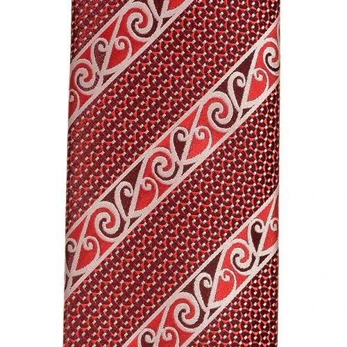 Maori Neck Tie - Red with Kowhaiwhai. The background colour is red with the pattern work in silver and burgundy, making this tie The stunning Kowha...
