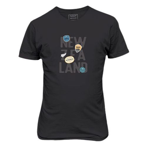 Adults NZ Badge Tee - Black. Cotton t-shirt. Black with printed logo. New Zealand themed Tee Shirt. A great souvenir or gift from New Zealand!