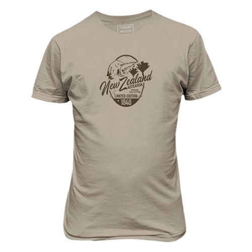 Adults NZ Kiwi Tee - Fawn. Cotton t-shirt. Fawn with printed logo. New Zealand themed Tee Shirt. A great souvenir or gift from New Zealand!