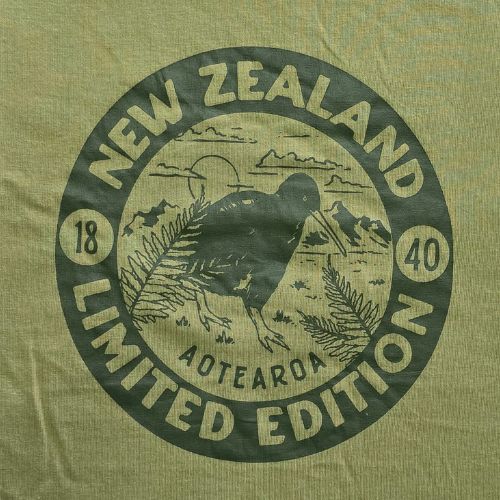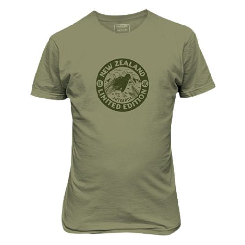 Adults NZ Kiwi Tee - Khaki. Cotton t-shirt. Khaki with printed logo. New Zealand themed Tee Shirt. A great souvenir or gift from New Zealand!