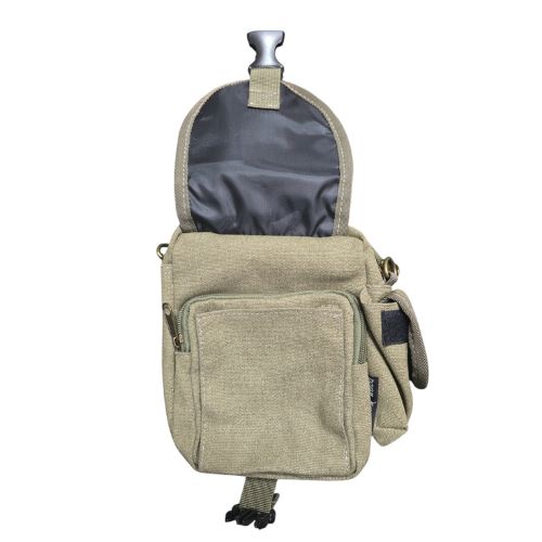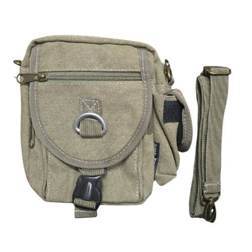 Khaki Canvas Shoulder/Belt Bag. Down Under. 1 Main compartment zipped pocket, 1 zipped pocket & 1 open pocket under front flap & small ph...