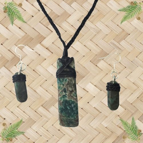 NZ Greenstone Drop Pendant & Earrings Set with Binding