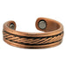 The human body is made up of magnetic fields. The air around us contains magnetic force which we absorb. Modern day electrical equipment lessens the amount of magnetic force in the air. Copper magnetic bracelets let your system absorb copper which is lacking in our soil and at the same time, the small magnets inserted in each end of the bracelet allow your body to absorb magnetism compensating for the loss of magnetic force in the air due to electrical interference e.g. Computers, Microwaves, High tension wires and all electrical appliances. They are bi polar or like a row of magnets set out end on end, these magnets are strong enough to penetrate the skin providing extra magnetic force to our bodies.