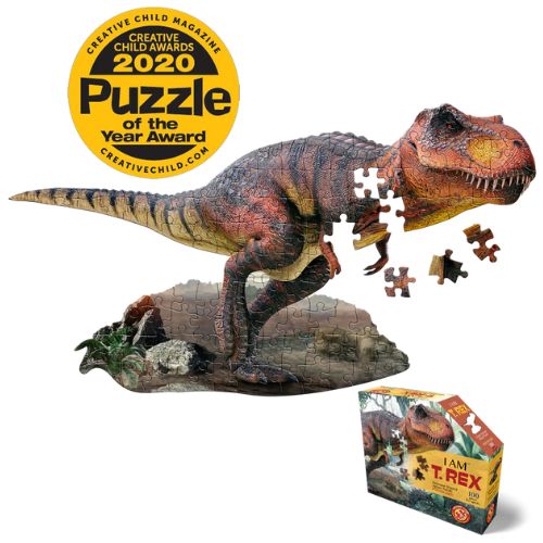 King of the World! Unique, dinosaur-shaped, 100-piece jigsaw puzzle for ages 6 and up.