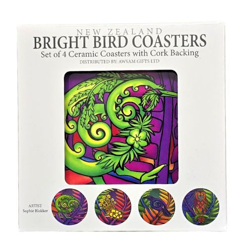 Set of 4 ceramic coasters with cork backing featuring art work by NZ artist Sophie Blokker.