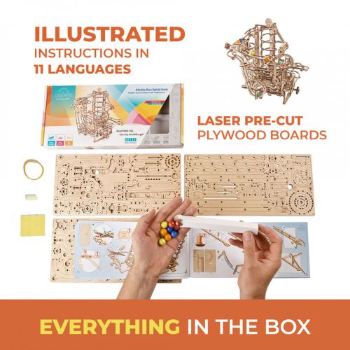 The Marble Run Spiral Hoist wooden mechanical model consists of 266 parts, is rated "advanced" level, and provides 6+ hours of fun assembly time. No glue or other tools are needed for assembly. Just snap the parts out of their laser pre-cut plywood boards and connect them together, following the detailed, illustrated instructions in 11 languages (English, German, Spanish, French, Italian, Polish, Ukrainian, Chinese, Japanese, Korean, and Russian) included in each Ugears kit.