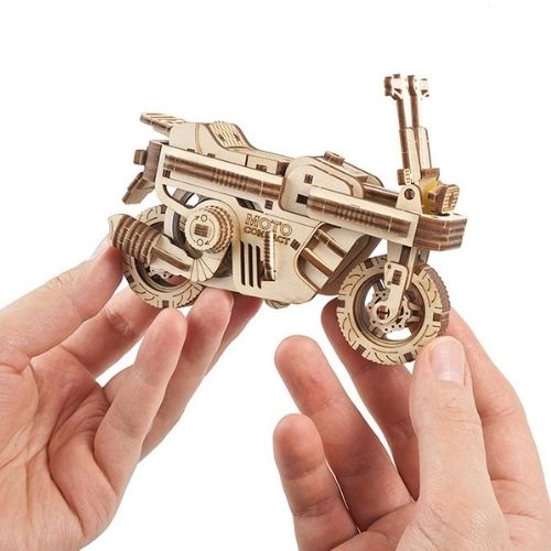 The Moto Compact folding scooter 3D puzzle packs quite a bit of power for its size. The wooden model scooter is driven by a spring-loaded engine, and is able to travel 2 m (six feet) on a single wind-up. The handle bars can be placed in one of three positions to send your Moto on a straight course, or curving to the left or right. Because this is a Ugears model, and because we delight in packing as much mechanical action as we can into our wooden DIY models, the Moto Compact comes loaded with great features, including front and rear suspension, and sophisticated folding capability for safe and easy transport.